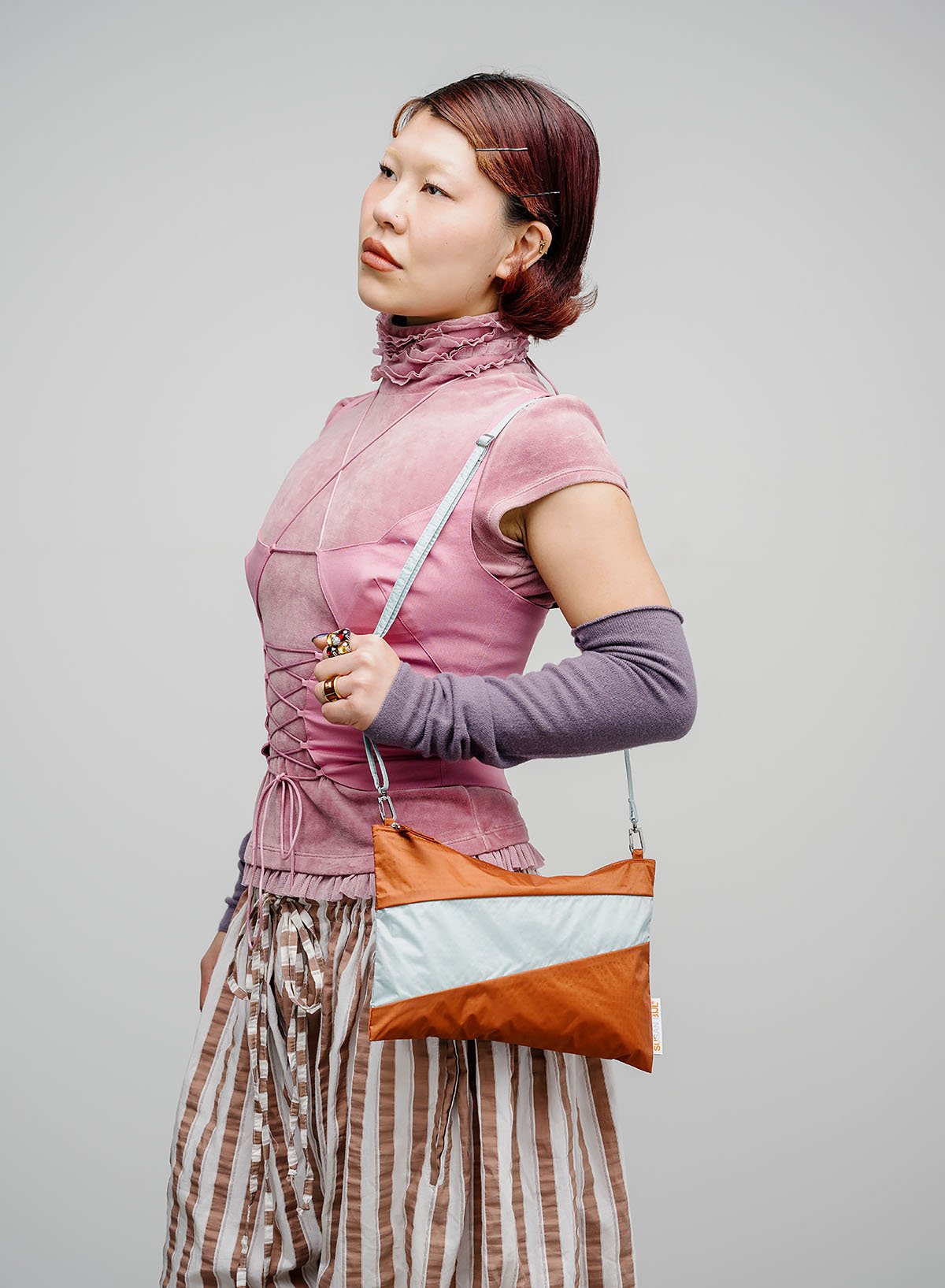 The Susan Bijl The New Pouch Cinnamon & Surf Spray Medium is a lightweight waterproof pouch made from 100% recycled ripstop nylon. Ideal as an organizer, make-up bag or compact crossbody bag with an optional strap.